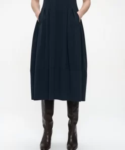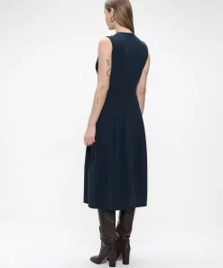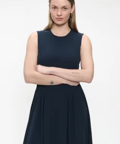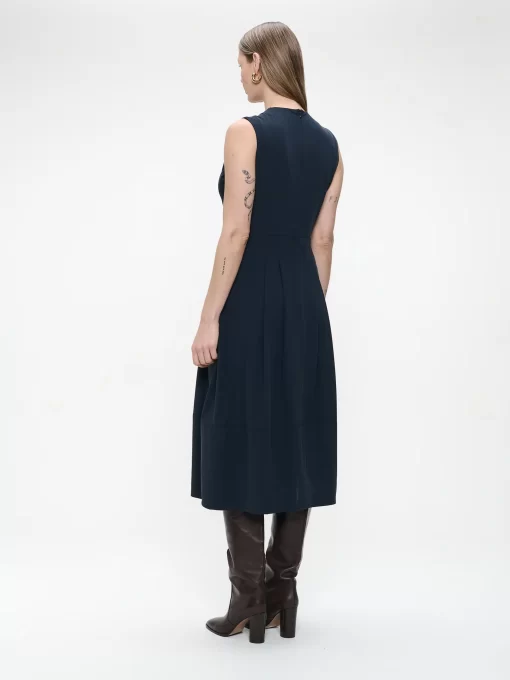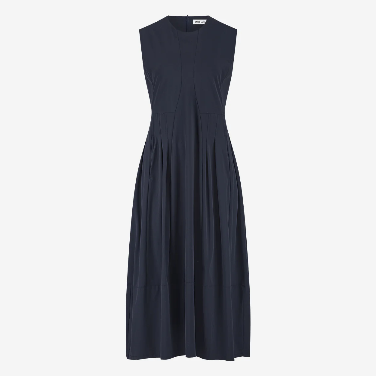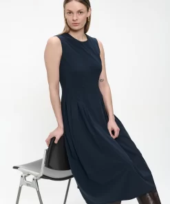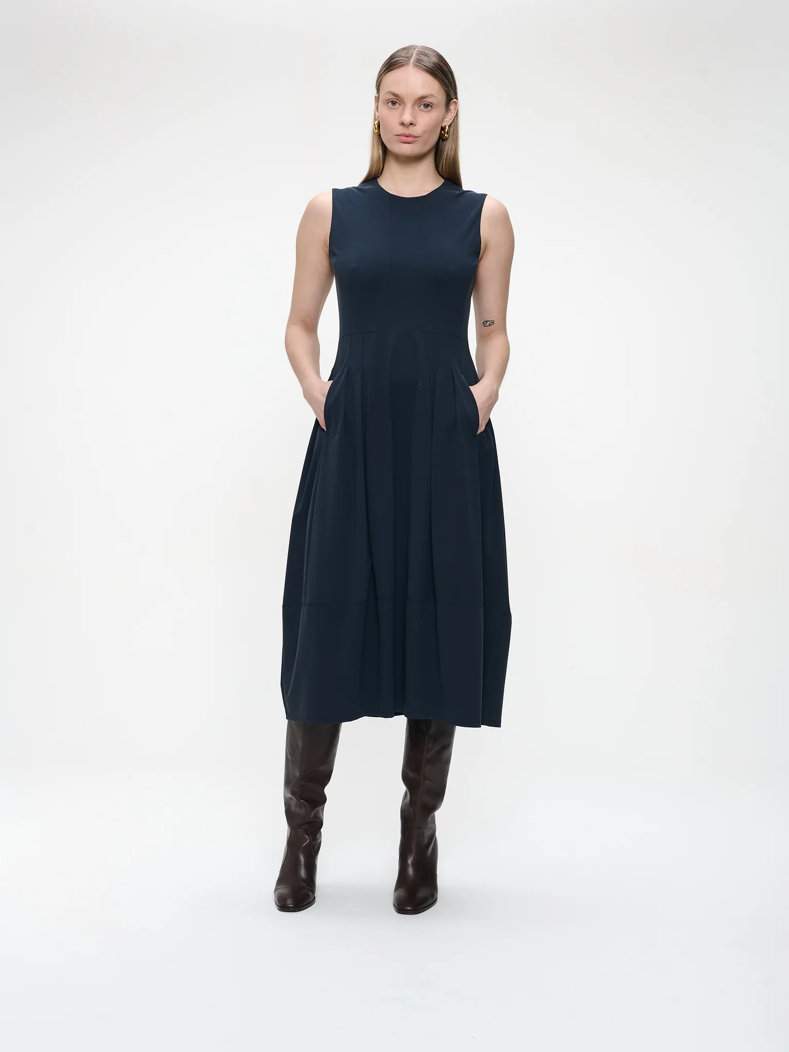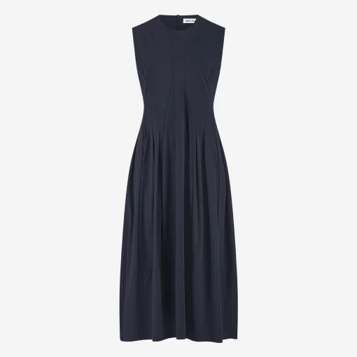 Elegant in its simplicity, the Heide Dress features a sleeveless silhouette with a round neckline and soft pleats that fall gracefully from the waist. Crafted from technical jersey, it offers fluid movement and everyday comfort while retaining a refined structure. The midi length and timeless shape make it perfect for both casual sophistication and elevated layering.