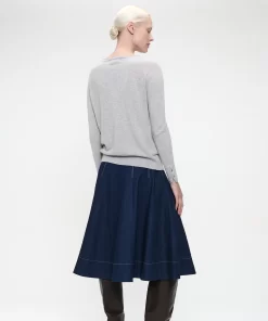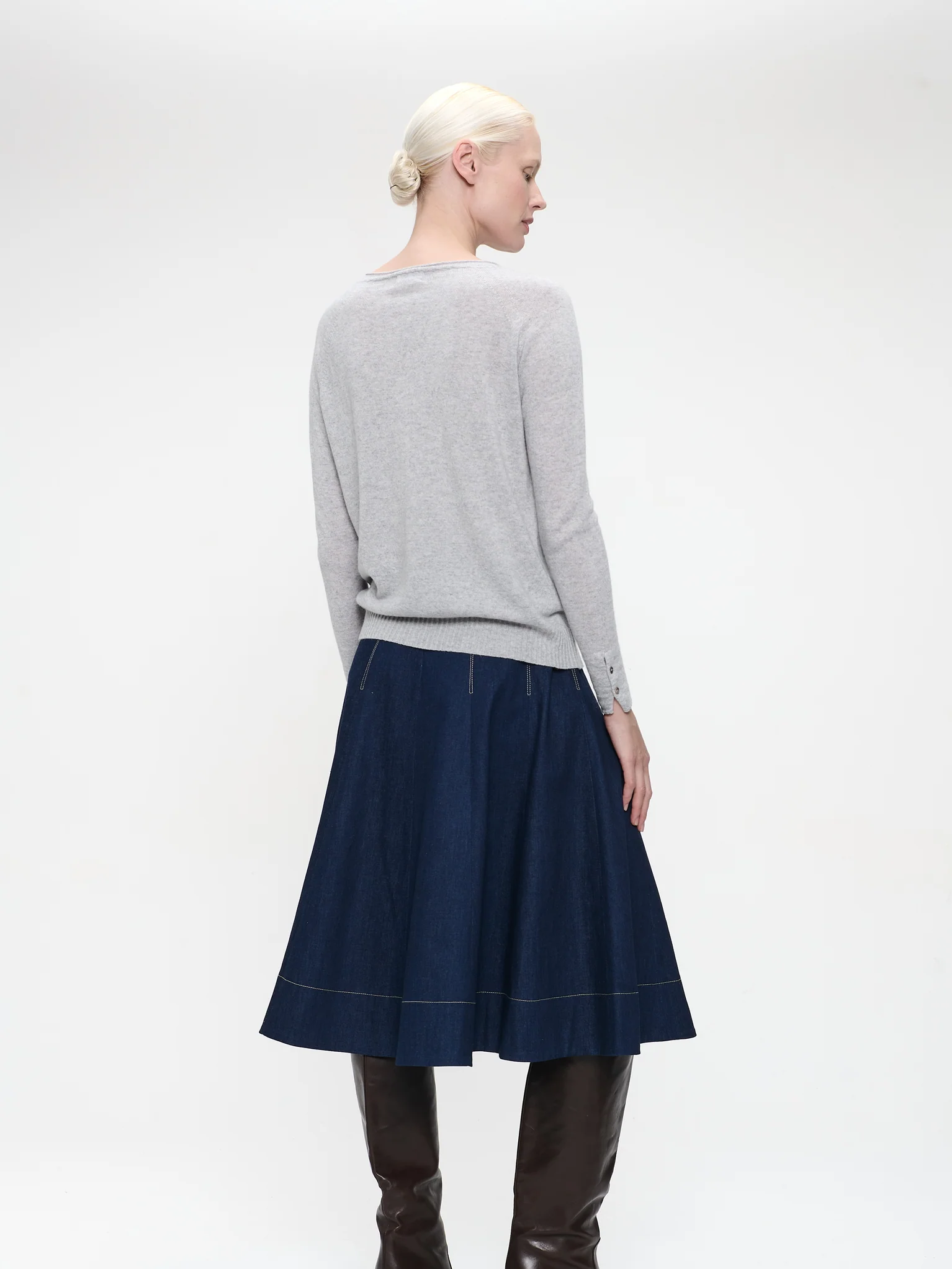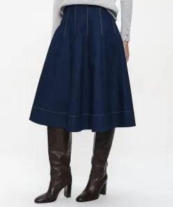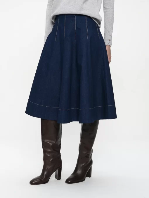 A-line denim Mishele skirt that brings together structure and femininity. The stitched pleat details add visual interest and shape, while the mid-calf length and dark indigo color provide timeless elegance. Pair it with soft knitwear or tailored shirts for versatile styling throughout the season.