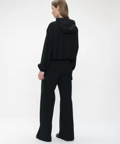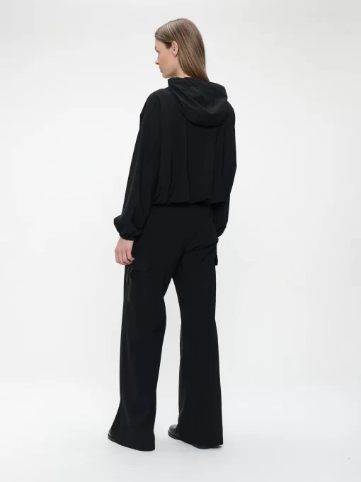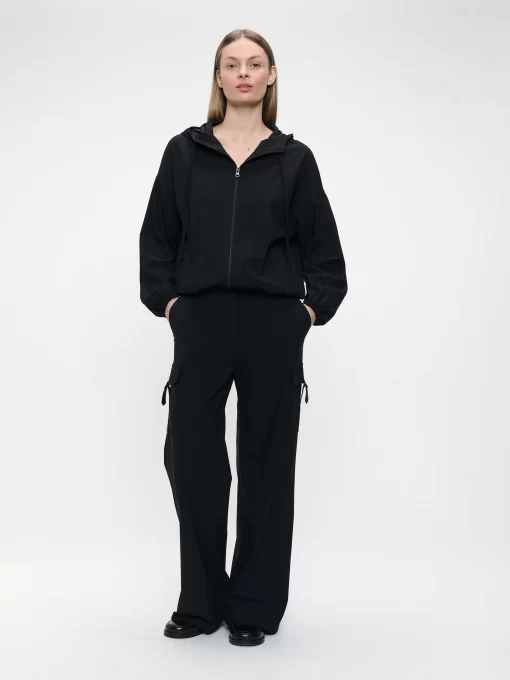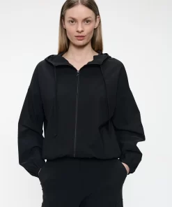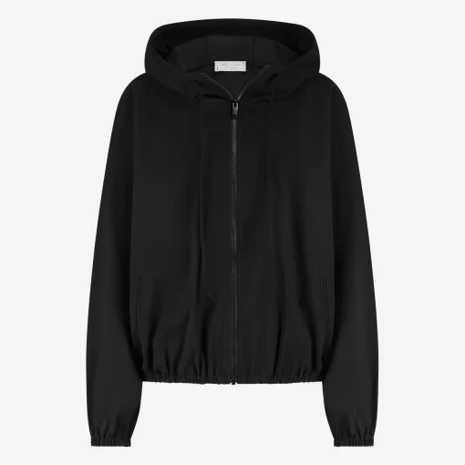 The Misi jacket (SU125129) is the perfect fusion of sporty comfort and everyday elegance. Made from soft technical jersey, this hooded jacket features a relaxed fit with elasticated cuffs and hem, creating a slightly voluminous silhouette. The front zipper adds function and edge, while the matte black fabric brings understated sophistication. Perfect for laid-back styling or layered with tailored pieces.